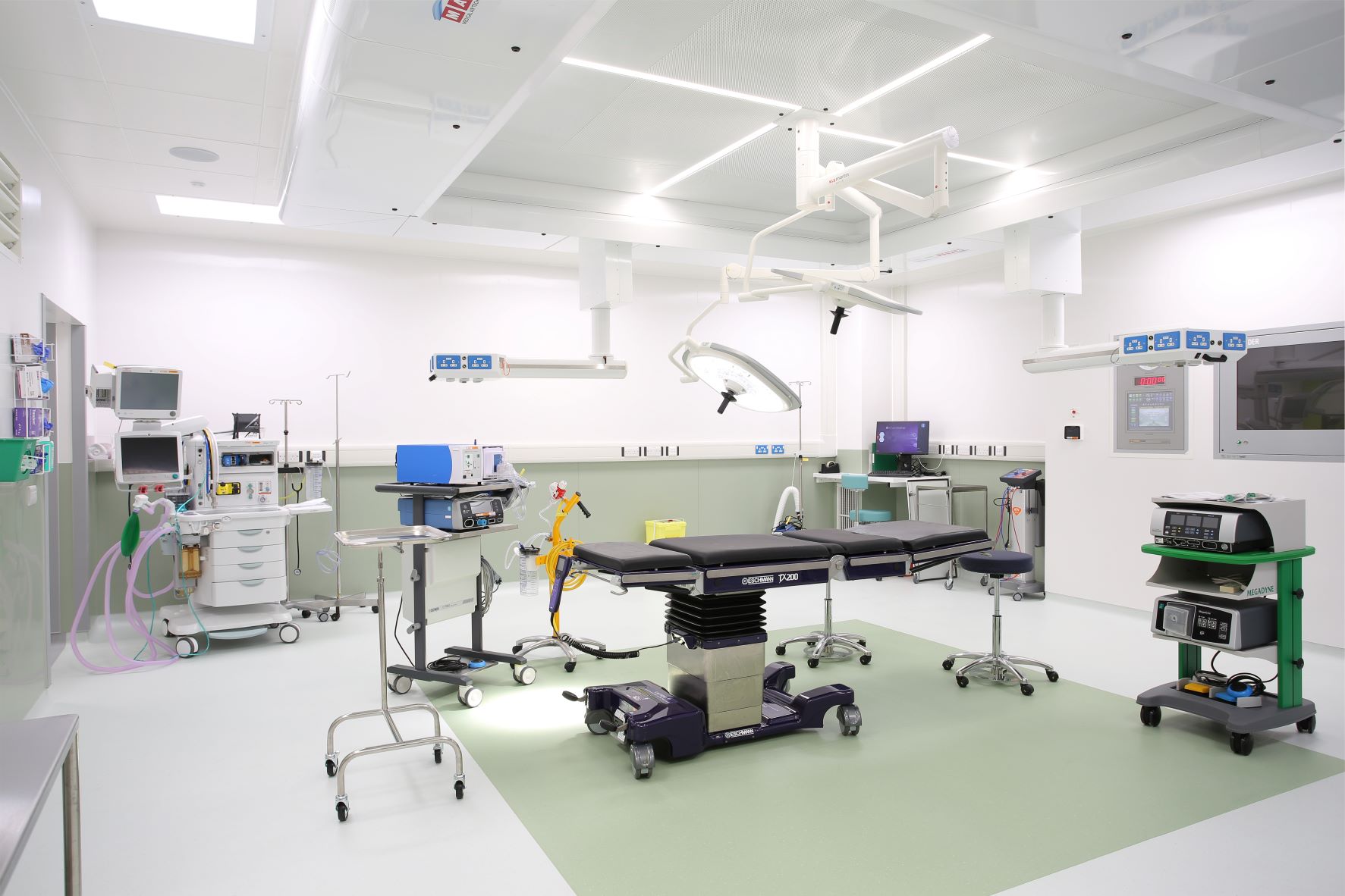 The single storey facility houses the 4 orthopaedic operating theatres each with dedicated prep and anaesthetic, a bright and spacious reception and waiting area, 8 bed recovery bay, offices, theatre store, staff rest and all necessary ancillaries. A dedicated top floor plant room was provided to support the whole scheme. Each of the 4 theatres are equipped with 3m MAT ultra clean canopies, with integrated multi-movement pendants. The integrated pendants allowed MTX to maximise the size of the canopy, whilst ensuring that all 4 theatres fit within the site constraints.
